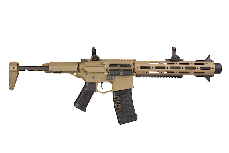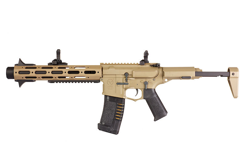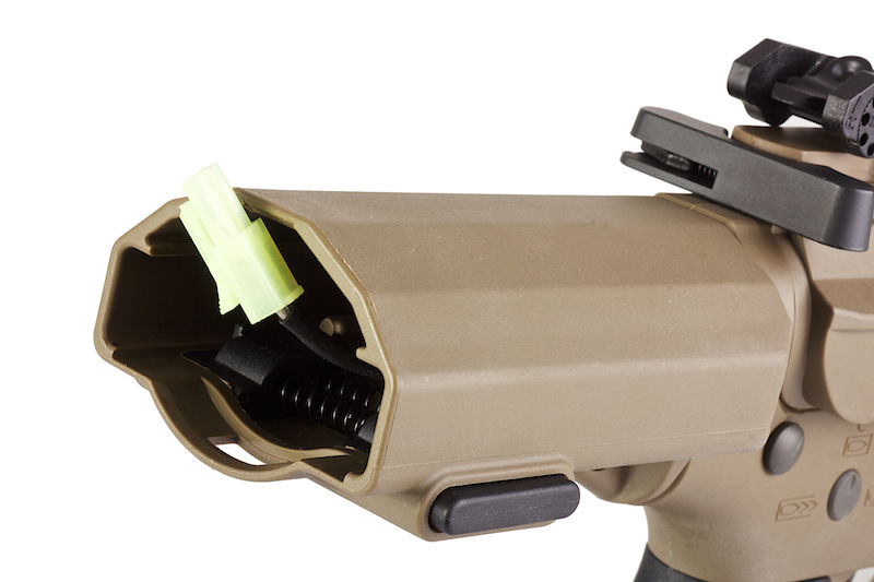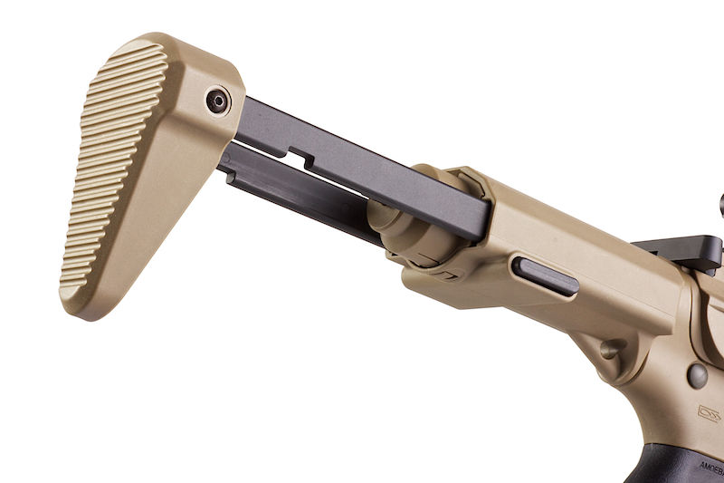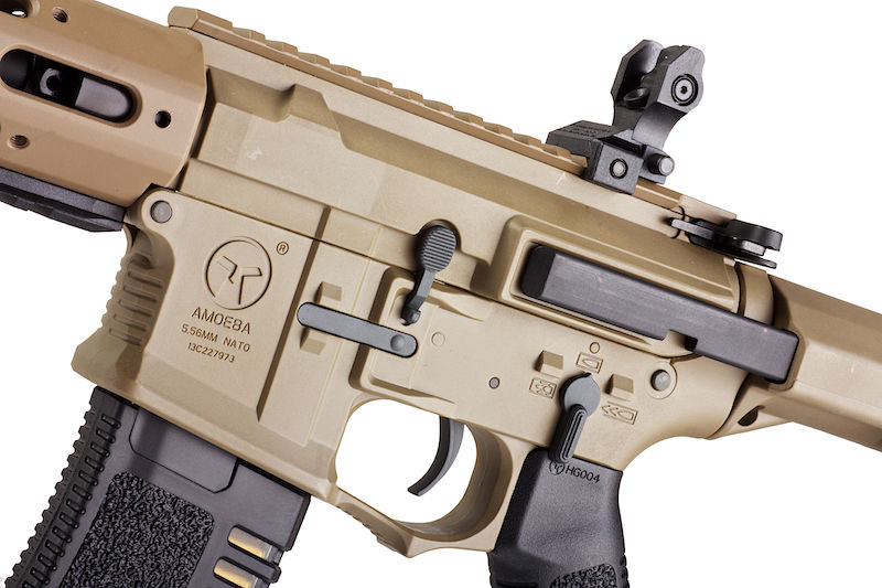 A lot of people have gone and customized their own version but ARES are the only company that have listened and set off to design the AM-013 and AM-014 which closely resembled the AAC Honey Badger PDW. It fits in with their Amoeba line as their receiver hasn't changed but they've managed to add the stylish HB extendable stock, a free float hand guard and a mock suppressor protruding out the front. Sure the hand guard is a little longer, but we are sure ARES will come out with a shorter hand guard version. It works with the ARES / Amoeba Electronic Gearbox Programmer for ARES Electronic Firing Control System Gearbox so you can set your AEG to burst fire if you prefer. The trigger response is excellent and works best with a 7.4v PEQ battery which is stored in a small compartment of the stock. It's a little fidgety, but it fits perfectly so you don't get any rattling.