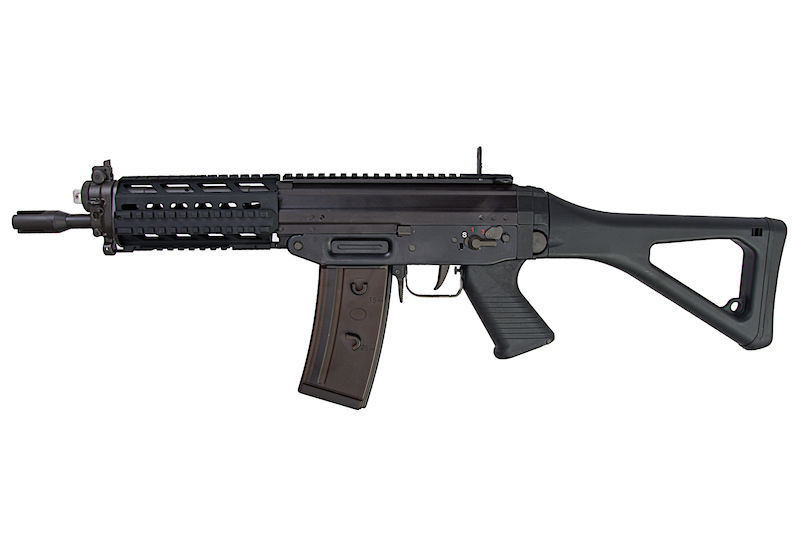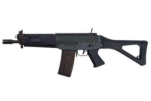The SG 550 family is a gun manufactured by firearms maker Swiss Arms a former division of Schweizerische Industrie Gesellschaft. The SG 553 is an improved version of the SG 552 and was released in 2008. Even though it mostly resembles the SG 552, the SG 553 has one key advantage, the recoil spring is now wrapped around the piston rod like in the SG 550/551 models, which address several reliability issues encountered in the SG 552 and also allows the usage of the standard SG 550/551 charging handle. The SG 553 series rifles have a 339 mm (13.3 in) long sight radius. A long barrel version of the SG 553 known as the SG 553 LB incorporates a 347 mm (13.7 in) barrel with provision to fire rifle grenades and support a bayonet. Further factory options for the SG 553 rifle series are an integrated receiver Picatinny rail and an adjustable butt stock.