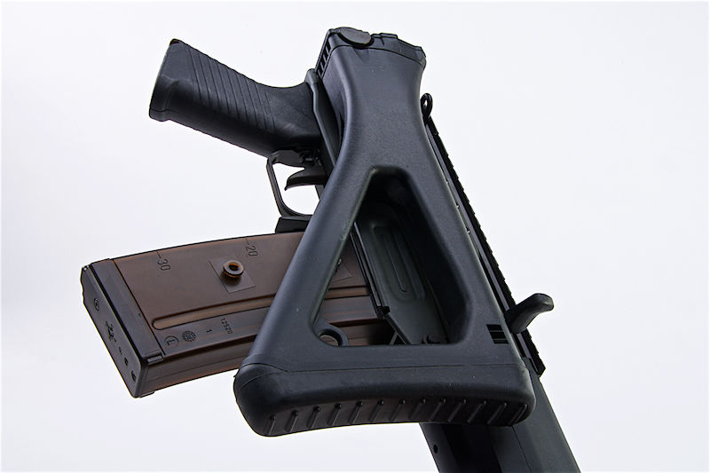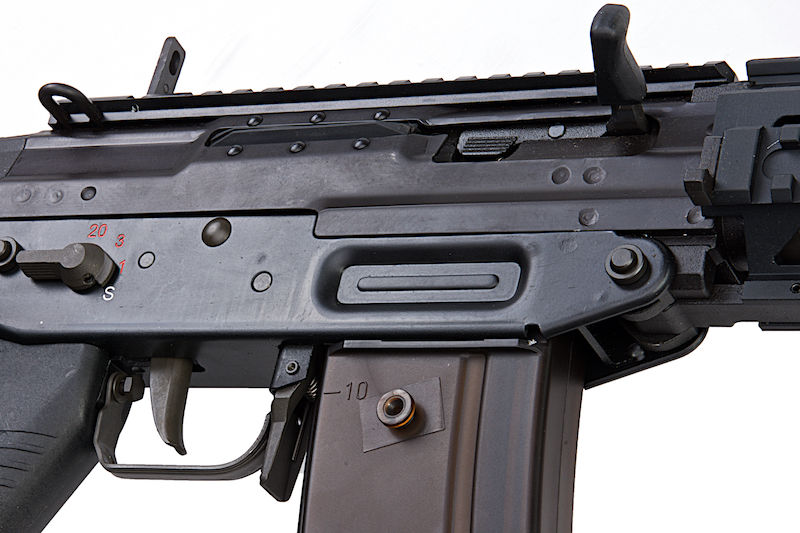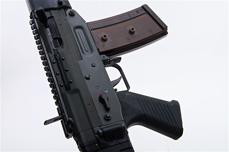 Three firing modes: Semi, three round burst, full auto.