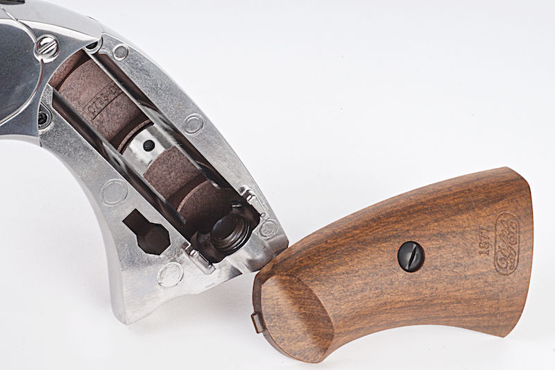 This does mean it will come with 6 cartridges which fit one 6mm BB in the front of each one. The 1877 MAJOR 3 is CO2 powered as the capsule is stored in the grip. You will need to loosen the screw underneath and remove the left grip plate to place the capsule inside. The power of the CO2 gives this MAJOR a fps of 360 with a loud bang that comes along with it which is hugely satisfying.