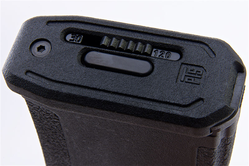 The PTS Enhanced Polymer Magazine, or EPM for short, is a new type of Polymer Magazine for airsoft rifles. The EPM is a truly unique magazine, inside and out. Externally it features a polymer shell, with recessed panels for better grip, and unique magazine well guides that reduce snagging when the magazine is drawn from and reinserted into pouches. The front of the baseplate features a dot matrix which allows the user to mark the magazine with alphanumeric characters or pictograms for identification. With a new 30/120 rounds flick at the bottom of the magazine, you can easily switch from 30 to 120 rounds for your airsoft needs.Specifications: