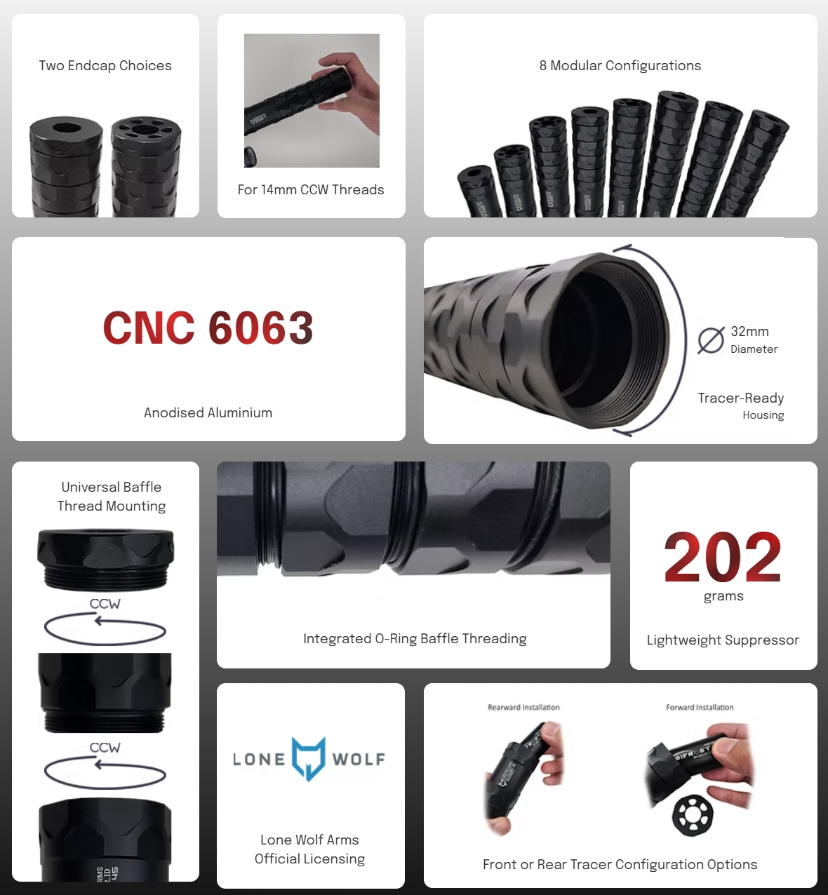 Available in two dynamic packages: grab the Standard Version as a standalone housing, or level up with the Tracer Version featuring a pre-installed Acetech Bifrost Tracer Module. As a unique add-on to the Bifrost, we've included a Bifrost Shroud adapter that prevents any wobbling when installed into our Elimin8r. If you already have a tracer unit or would like to use a unit of your choice, we've provided a generous set of shimming o-rings to ensure seamless compatibility with the various tracer brands. You can view our RWA Group Lone Wolf Elimin8r Product Page for more in-depth details about our RWA Elimin8r Suppressor, and to access our configuration guide provide inspirational ideas in creating your ideal suppressor length and tracer configuration!