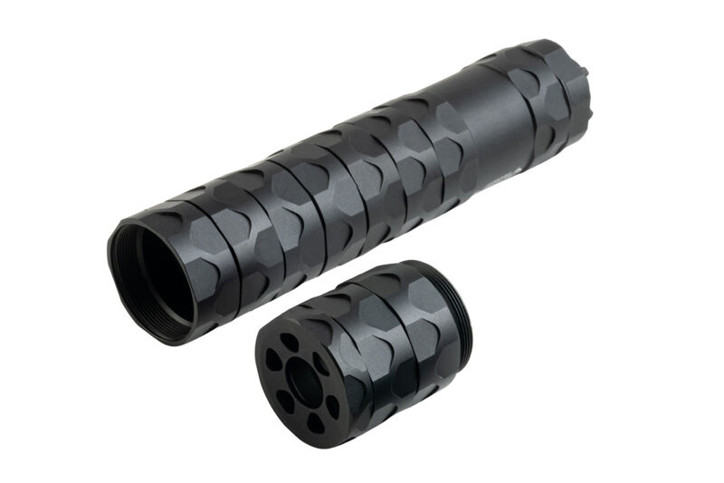 The RWA Elimin8r Airsoft Suppressor features 8 modular baffles for adjustable length and compatibility with popular tracers including Acetech, 5KU and others that have a maximum diameter of 32mm. Made from lightweight anodized 6063 CNC aluminum, it includes a 14mm CCW thread base and different sized o-rings for easy adjustments. Two end caps are included: one enclosed for realism and one skeletonised-vented design for tracer flash simulation. Durable, versatile, and performance-focused, it's the perfect addition to any airsoft setup.